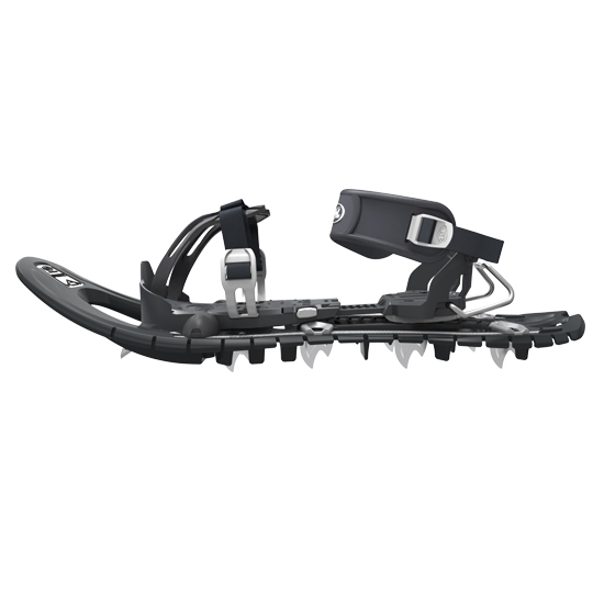 Jamais une raquette à neige n’a eu une accroche aussi impressionnante. Associés aux lames verticales, les crampons bidirectionnels en acier inoxydable placés sous les pieds permettent une traction optimale en montée, une excellente retenue en descente et une parfaite tenue latérale en dévers. Épousant la forme du terrain, la flexibilité du châssis assure un superbe maintien, une complète sécurité et évite le glissement intempestif en poudreuse.